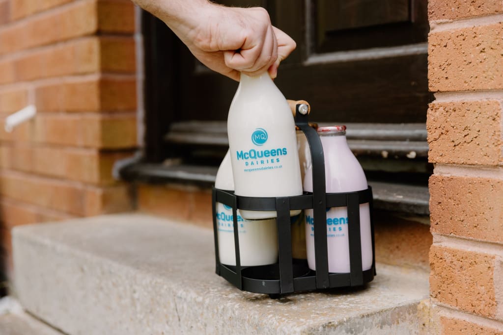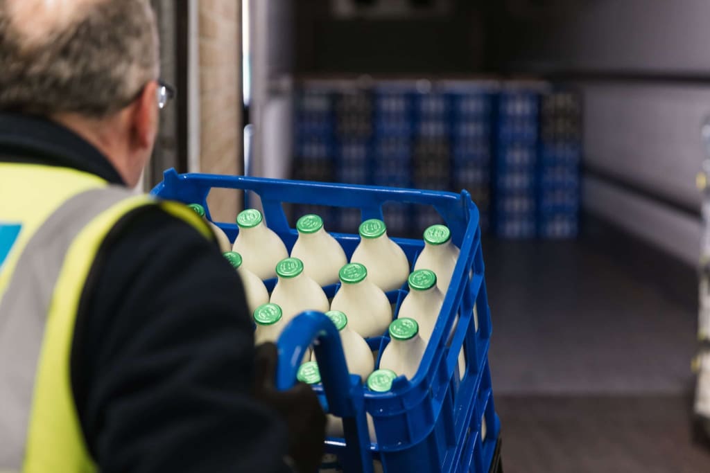Glass bottles are collected from the doorstep and reused as part of the delivery cycle.
